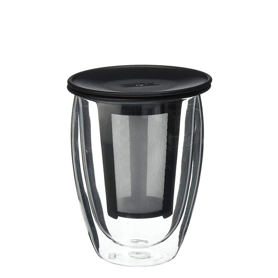Add tea leaves and water and you have everything you need for a single cup of tea with Bodum's Tea for One. The tea strainer fits the Pavina double wall glass and  the lid doubles as a cover to keep your tea warm while brewing and a trivet to prevent dripping. The generous size of the strainer allows the tea leaves to swirl freely while steeping for a delicious single-serving.