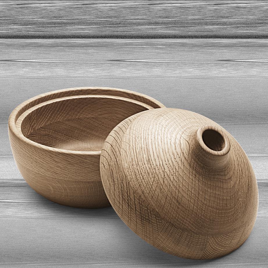 Lengendary designer Henning Koppel originally designed the Oak Bonbonniere in the 60's. It was not produced commercially at the time – only two were crafted. One was gifted to a friend and the other Koppel kept for himself. Discovered in the Georg Jensen archives, the design for the beautiful acorn-shaped piece was reintroduced in 2015. This timeless two-piece is made of warm, smooth oak and will make an attractive addition to your decor.