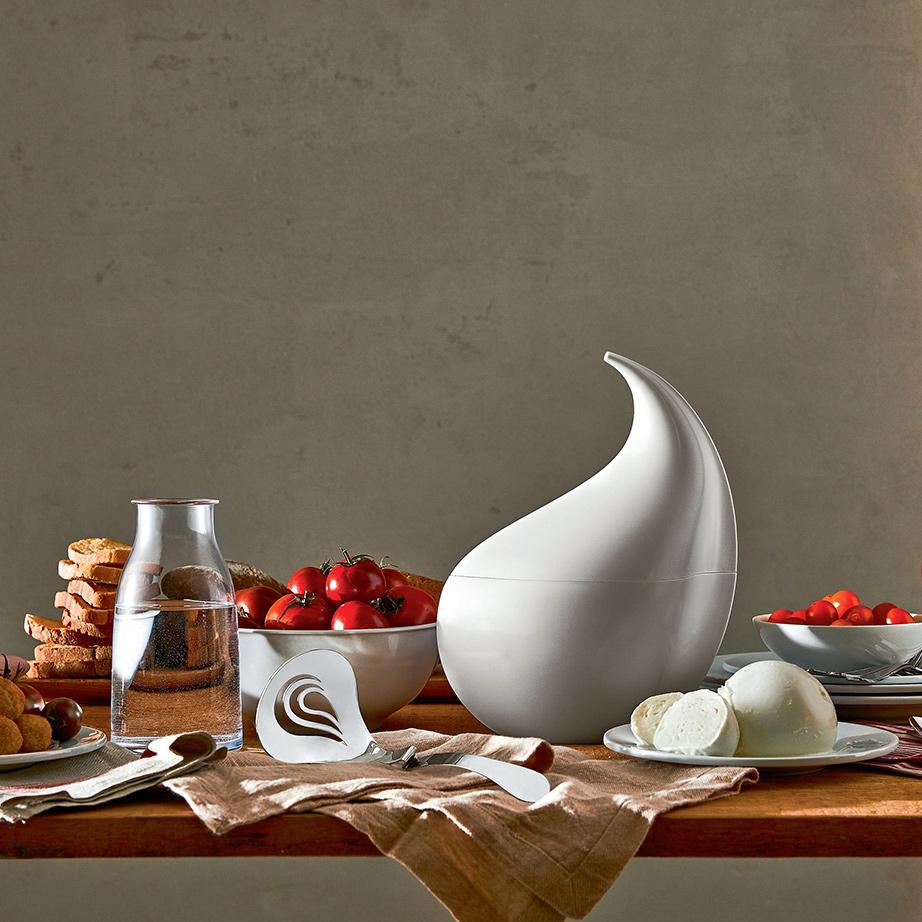 Created by Emma Silvestris for Alessi, Nunziatella is for serving and preserving fresh mozzarella. This stunning set was designed at the behest of and under the guidance of the Consorzio di Tutela Mozzarella di Bufala Campana DOP, the consortium for producers of one of Italy's finest culinary contributions, Buffalo mozzarella. The soft, evocative shape of the thermoplastic container resembles a drop of milk and the contours of the horns that distinguish Italian water buffaloes. The stainless steel perforated ladle allows you to lift the cheese from the water to serve.