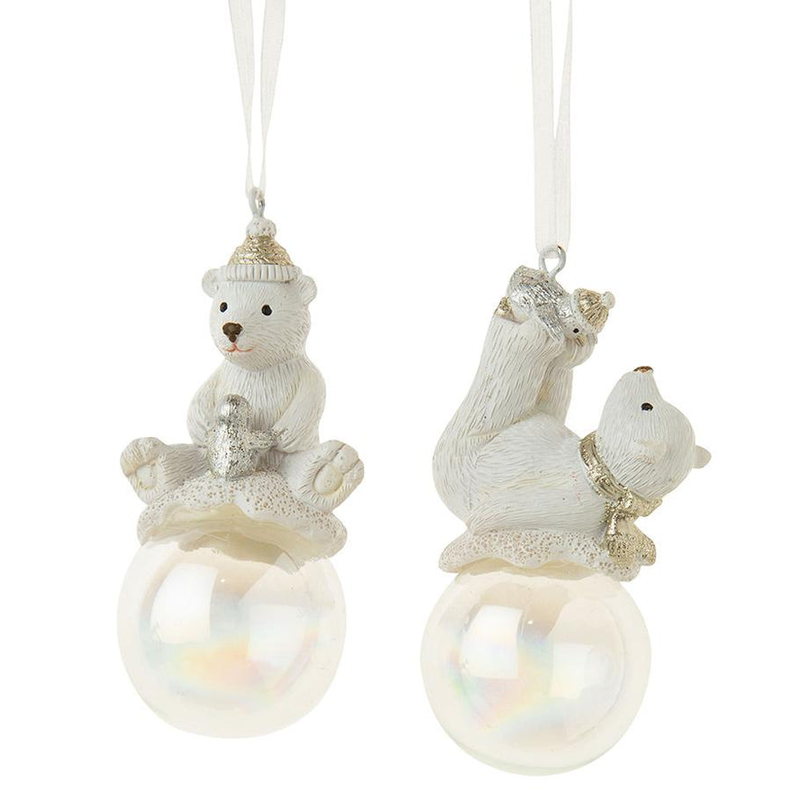 Perched atop iridescent glass orbs, the resin animals from Silver Tree's First Frost Collection add subtle sparkle to your holiday decor.